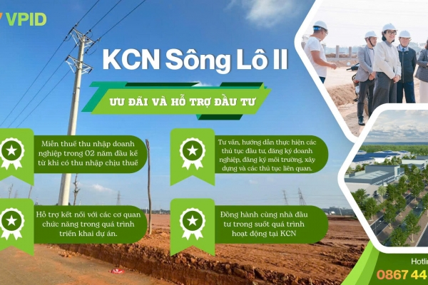 • Trong làn sóng dịch chuyển chuỗi cung ứng toàn cầu, KCN Sông Lô II được định vị là điểm đến chiến lược tại trung tâm vùng trung du phía Bắc, với chính sách ưu đãi đầu tư cạnh tranh và môi trường pháp lý minh bạch.