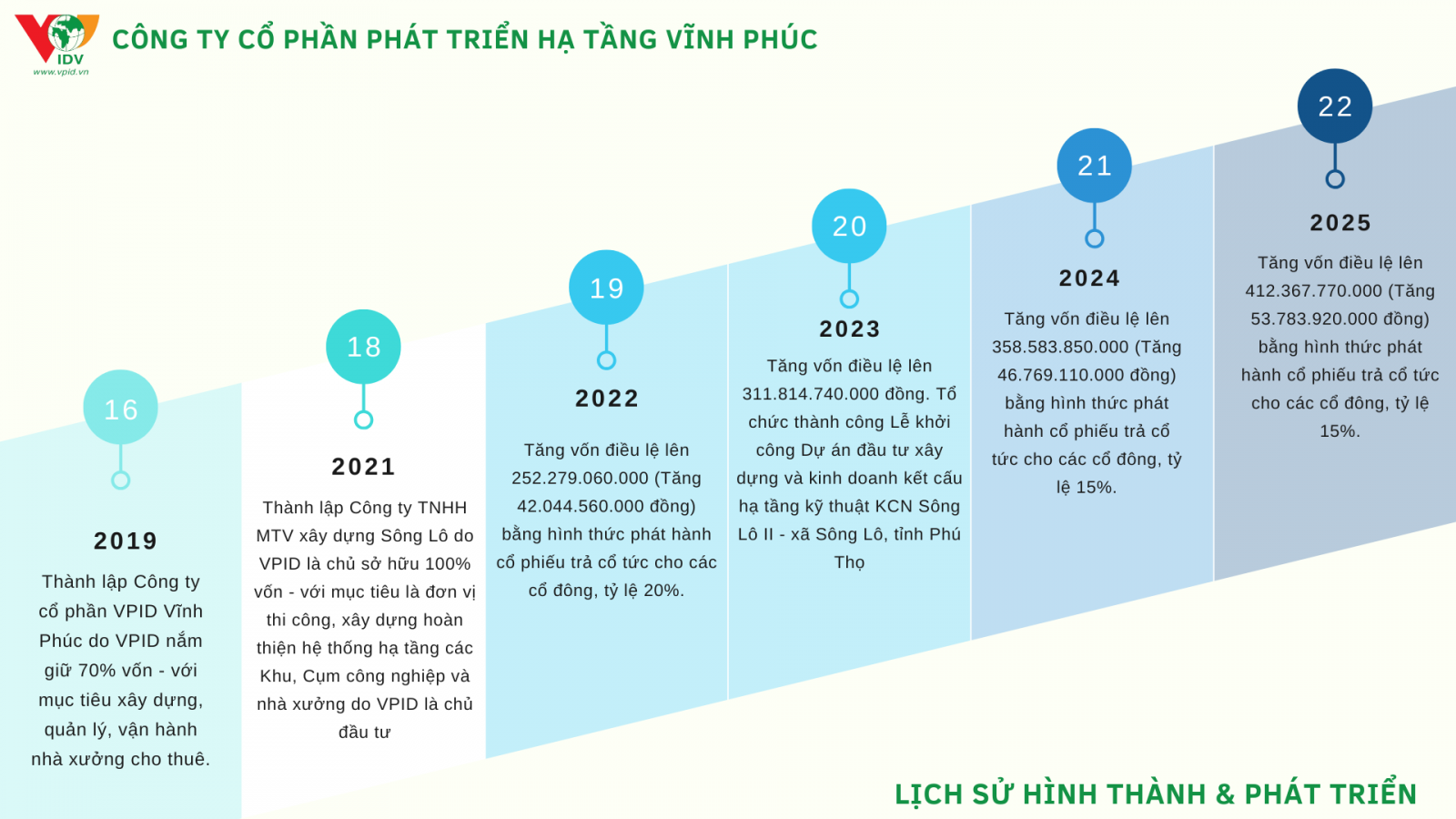Ngày 12/09/2019 Thành lập Công ty cổ phần VPID Vĩnh Phúc do VPID nắm giữ 70% vốn  -  với mục tiêu xây dựng, quản lý, vận hành nhà xưởng cho thuê.